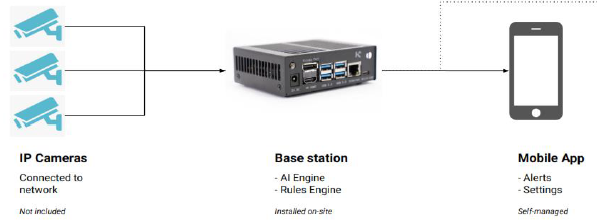 The AI models that are deployed to the base station and the distributed rule-based alerts system leverages the Trixta technology. The system consists of a base station connected to a local network and PWA mobile app to manage settings and alerts.
